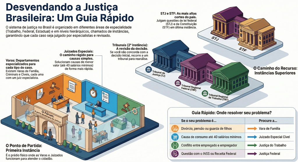 Você já se perguntou por que existem tantos nomes diferentes quando falamos de Justiça? Tribunal, vara, fórum, juizado... tudo isso pode parecer confuso, especialmente quando você precisa resolver um problema e não sabe exatamente onde ir. A verdade é que a Justiça brasileira é organizada como uma grande empresa, com setores, hierarquias e especializações. Vamos explicar de forma simples como tudo se encaixa, para que você entenda onde seu caso deve ser levado e como funciona essa estrutura toda.
